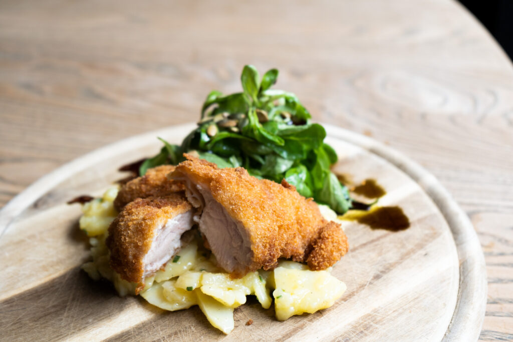 in krosser Panade ausgebacken, serviert mit Kartoffel-Vogerl-Salat und steirischem Kürbiskern-Öl