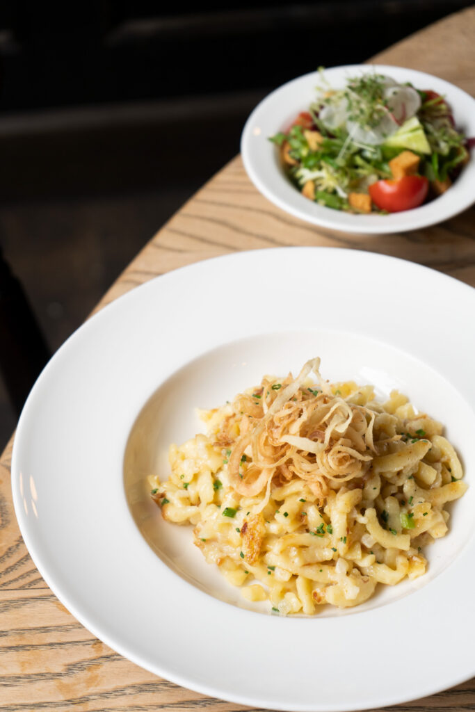 mit Röstzwiebeln und einem kleinen Beilagensalat
