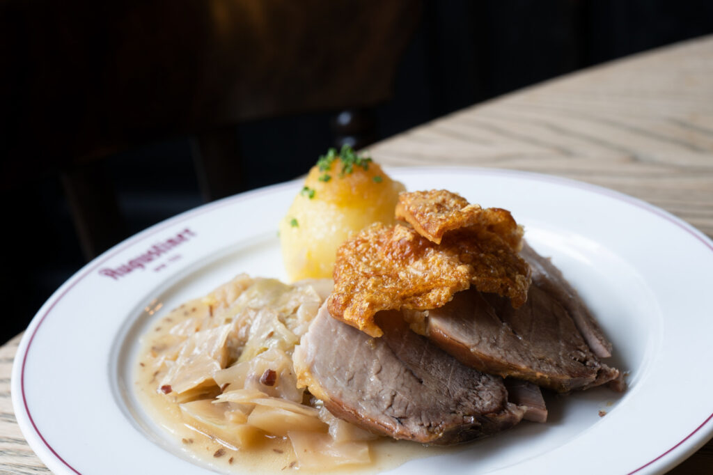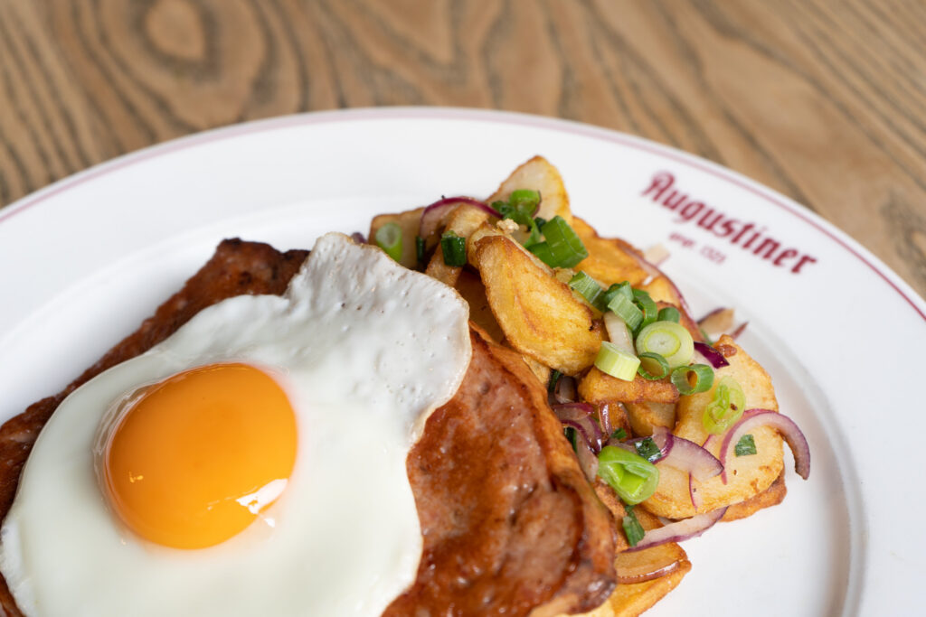 mit Bratkartoffeln und Augustiner Zwiebel-Biersauce